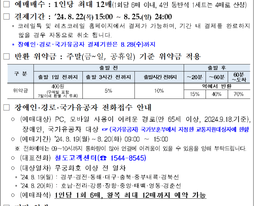 추석 기차표 예매는 미리 준비하면 더욱 원활하게 진행할 수 있습니다. 이 정보를 바탕으로 즐거운 추석 연휴를 맞이하시길 바랍니다.