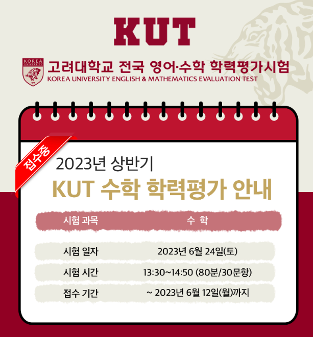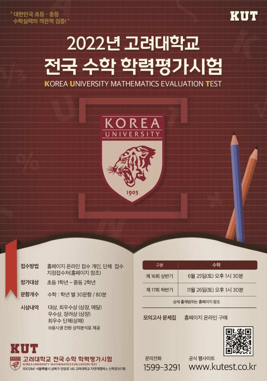 안녕하세요. 외부 수학시험에 나가시고자 하시는 수학원장님께서는 22년 6월에 진행되는 고려대 KUT 전국 수학 학력평가시험에 도전하세요! 고려대학교 KUT 수학학력평가시험은 학생들의 실력과